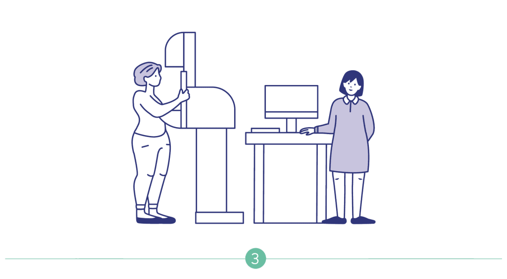 La manipulatrice qui vous prend en charge rรฉalise deux clichรฉs sur chaque sein, un de face et un en oblique.